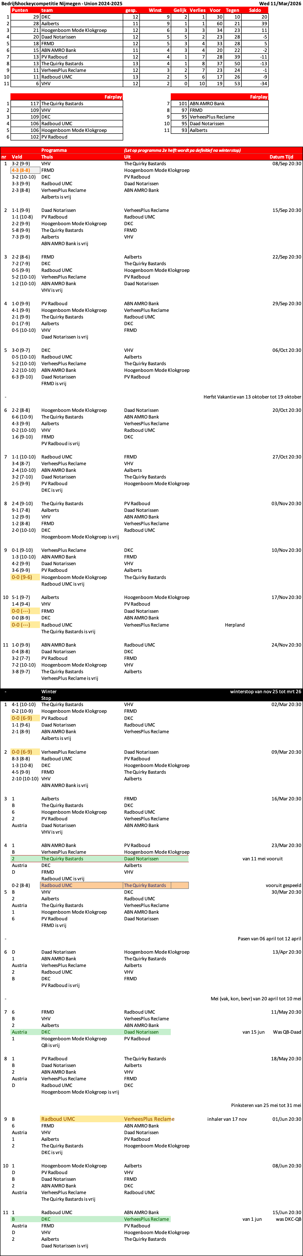 Op Union wordt elk jaar een gezellige bedrijfshockeycompetitie georganiseerd. Voor de competitie start is er ruimte voor nieuwe bedrijfsteams en voor individuele spelers die nog een bedrijfsteam zoeken. Neem daartoe contact op met: Henry van Doorn
